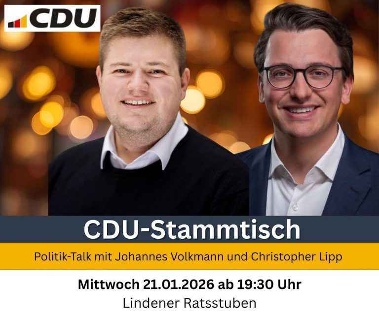 Wir freuen uns sehr, Dich hier begrüßen zu dürfen und möchten dich mitnehmen auf die politische Reise unseres Stadtverbandes und unserer Fraktion. Du findest hier aktuelle Termine, Themen und Informationen rund um das politische Geschehen der CDU Linden. Schaue immer mal wieder vorbei, informiere dich, gib uns Anregungen sowie Kritik zu unseren Themen in der Stadt Linden. Wir setzen uns gerne mit Dir zusammen, um gemeinsam Lösungen für alle Lindener Bürgerinnen und Bürger zu finden.